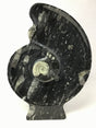 Transform your space into a natural history gallery with this striking Ammonite and Orthoceras Sculpture! Expertly carved from black seabed limestone into an elegant ammonite silhouette, this artistic piece showcases genuine ancient fossils within its polished surface. The dramatic contrast between the dark stone and exposed fossils creates a sophisticated display that's both educational and decorative. Standing proudly on its own base, this sculpture celebrates the beauty of prehistoric marine life while adding a bold, organic statement to modern interiors.