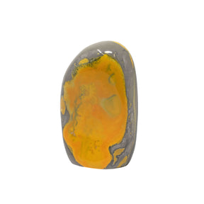 Bring nature indoors with this unique Bumblebee Jasper freeform polished cut base. Its pointed center and mustard yellow splashes of color make it a striking addition to any space. Perfect for home décor or collections, this one-of-a-kind mineral is sure to catch the eye.