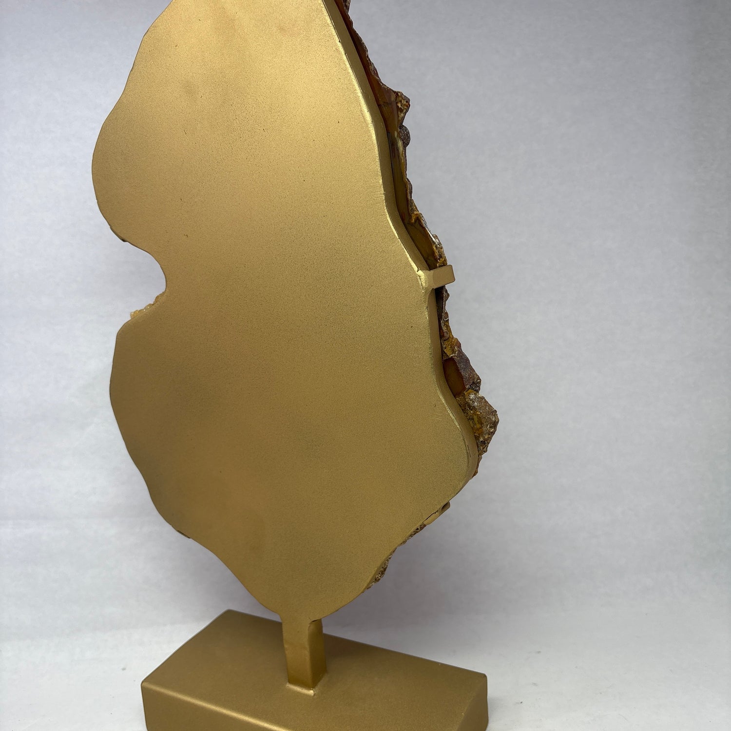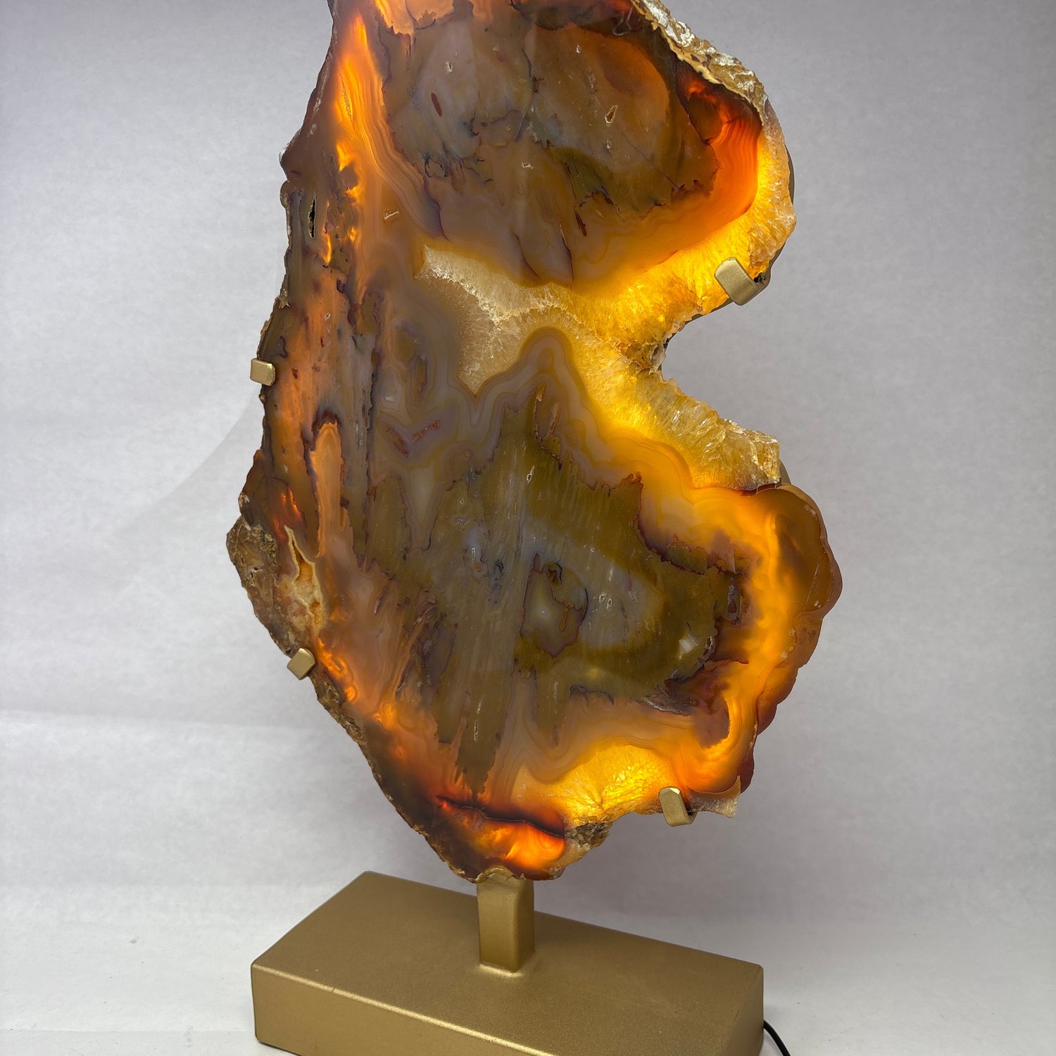 Ignite your space with fiery beauty using this Carnelian Agate Slice! Featuring vibrant orange and red banding that glows with inner warmth, this rectangular slice sits elegantly on a gold-finished illuminated stand. When lit, the translucent carnelian reveals its stunning layers and natural patterns, creating a captivating display that energizes any room. Known for boosting creativity and courage, this piece serves as both a striking decorative accent and a source of positive energy. Perfect for desks, meditation spaces, or bedside tables where its warm radiance can inspire and uplift!