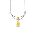 Elevate your elegance with this faceted yellow sapphire necklace, featuring a round prong-set gem nestled within a polished 925 sterling silver half-moon frame. Below, a faceted oval sapphire dangles gracefully, catching the light with every movement. This refined design balances modern sophistication with timeless charm, making it a captivating statement piece for any occasion.