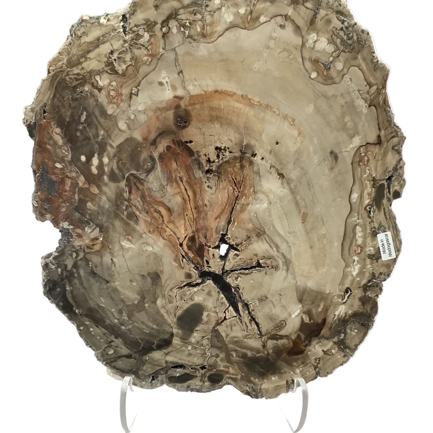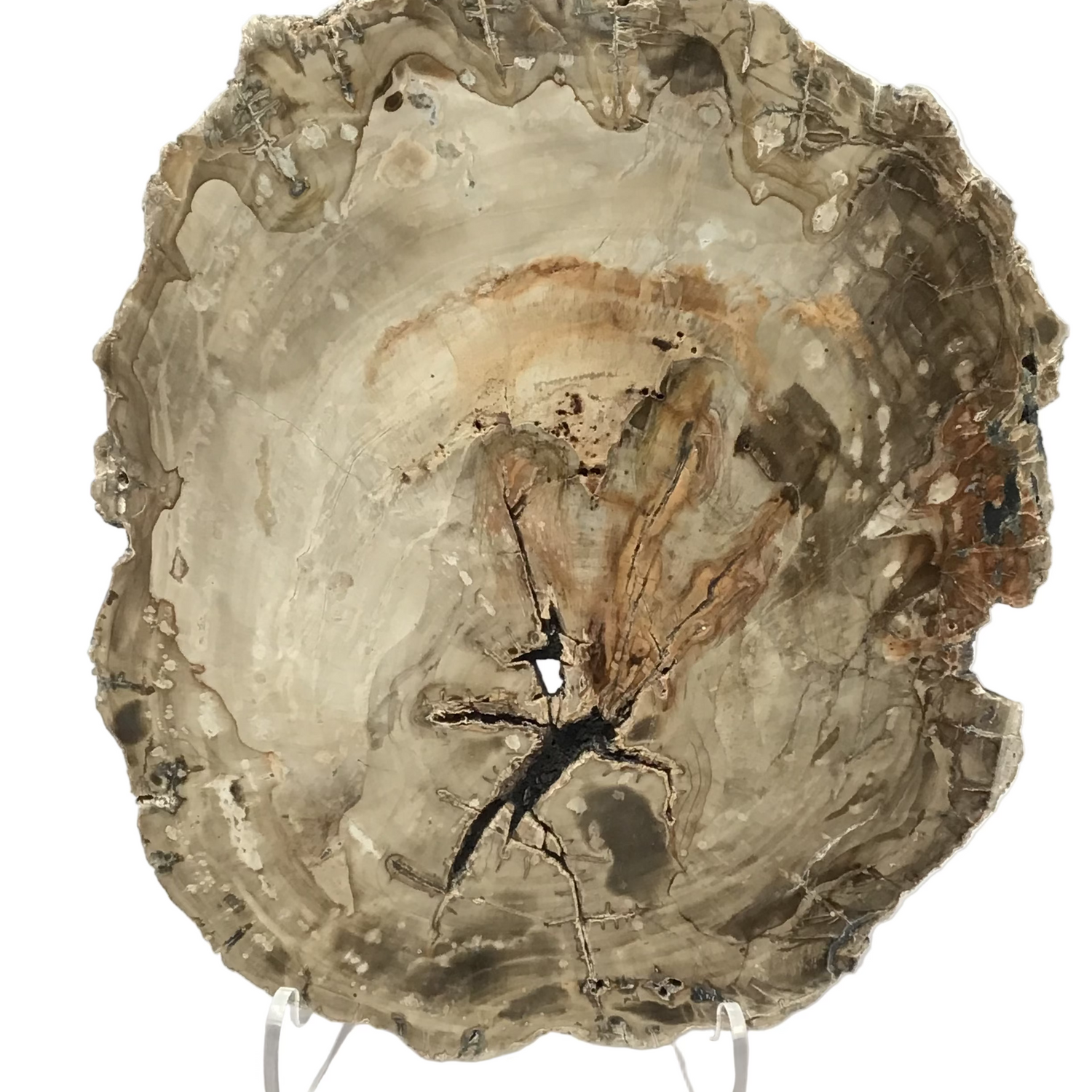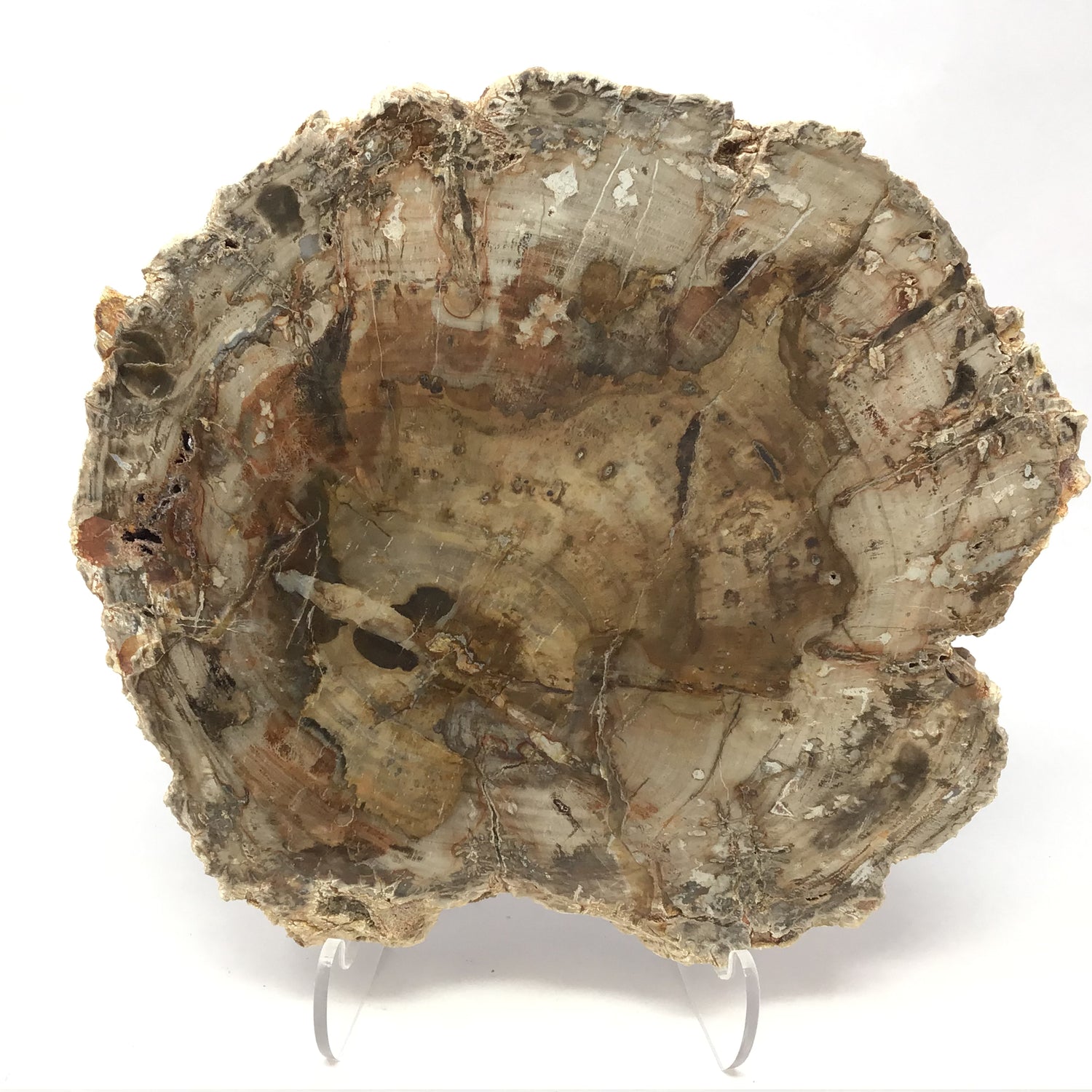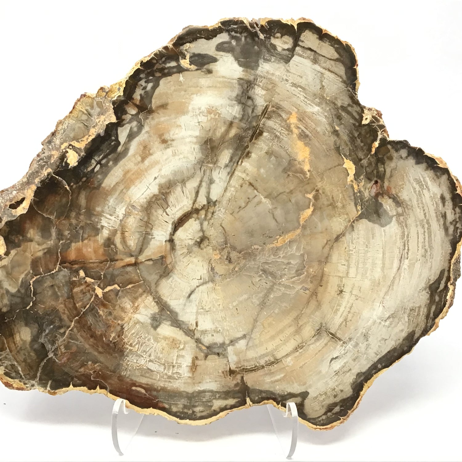 Madagascar Petrified Wood Slice with Natural Bark Edge - Medium on Lucite Easel