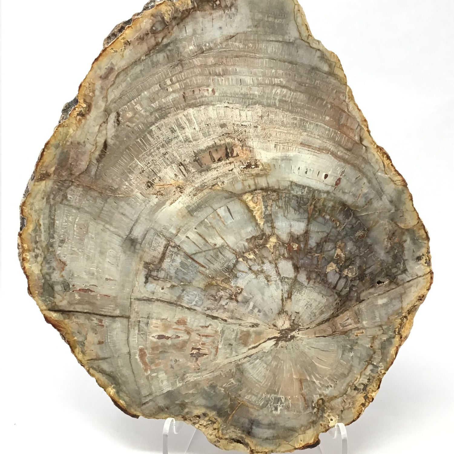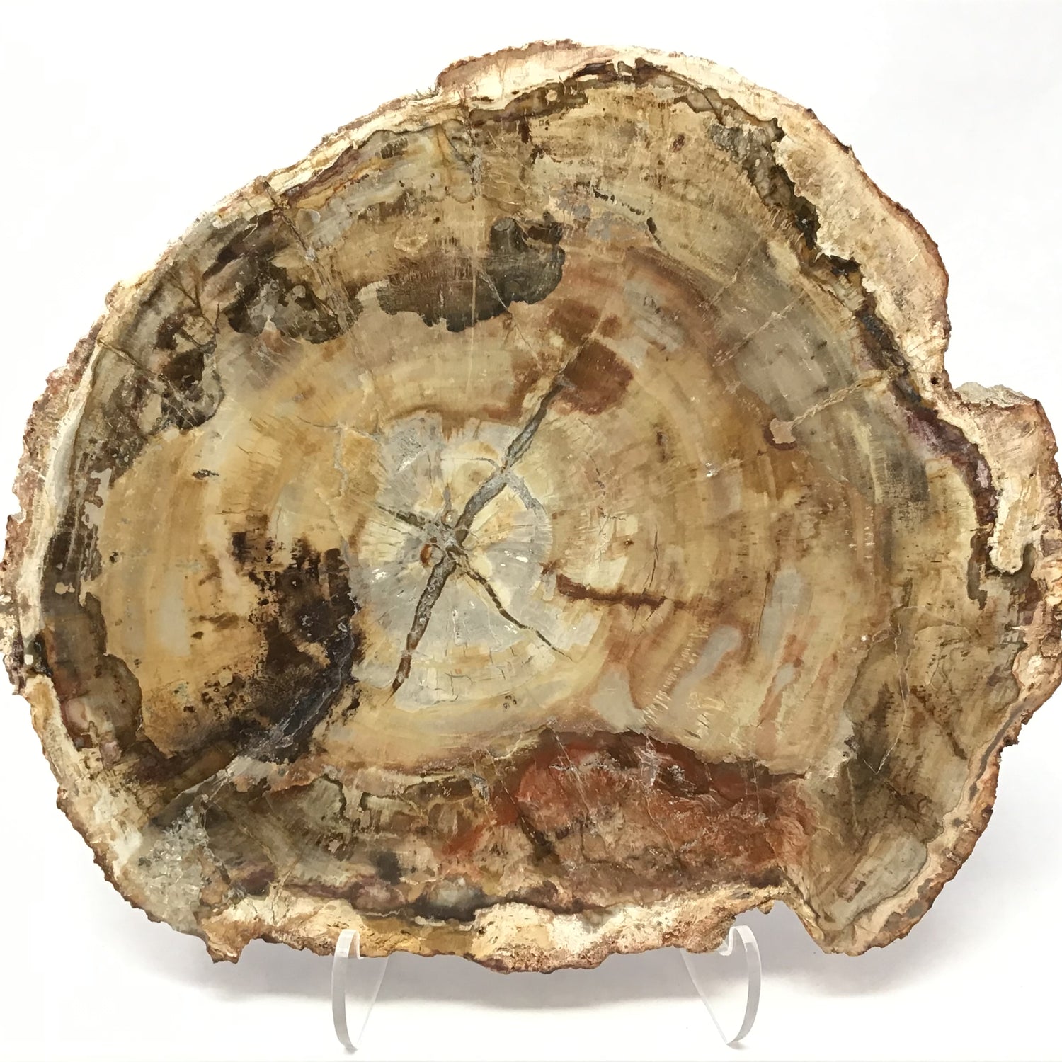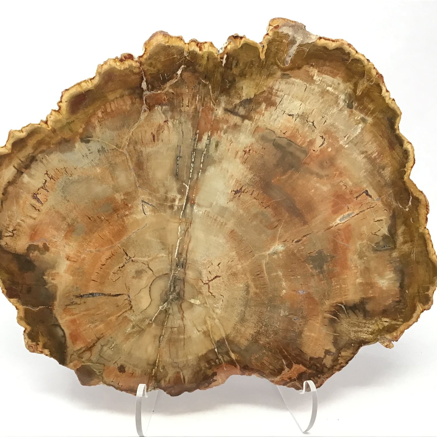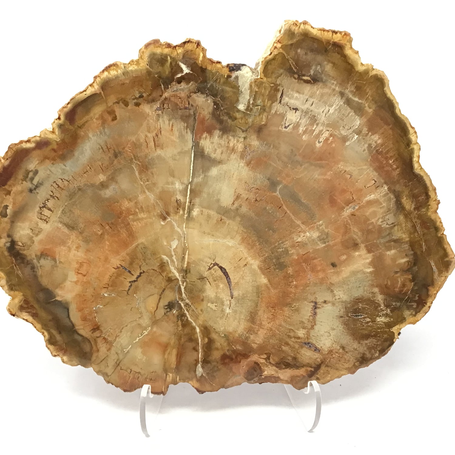 Madagascar Petrified Wood Slice with Natural Bark Edge - Medium on Lucite Easel - Pattern 2 is backordered and will ship as soon as it is back in stock.