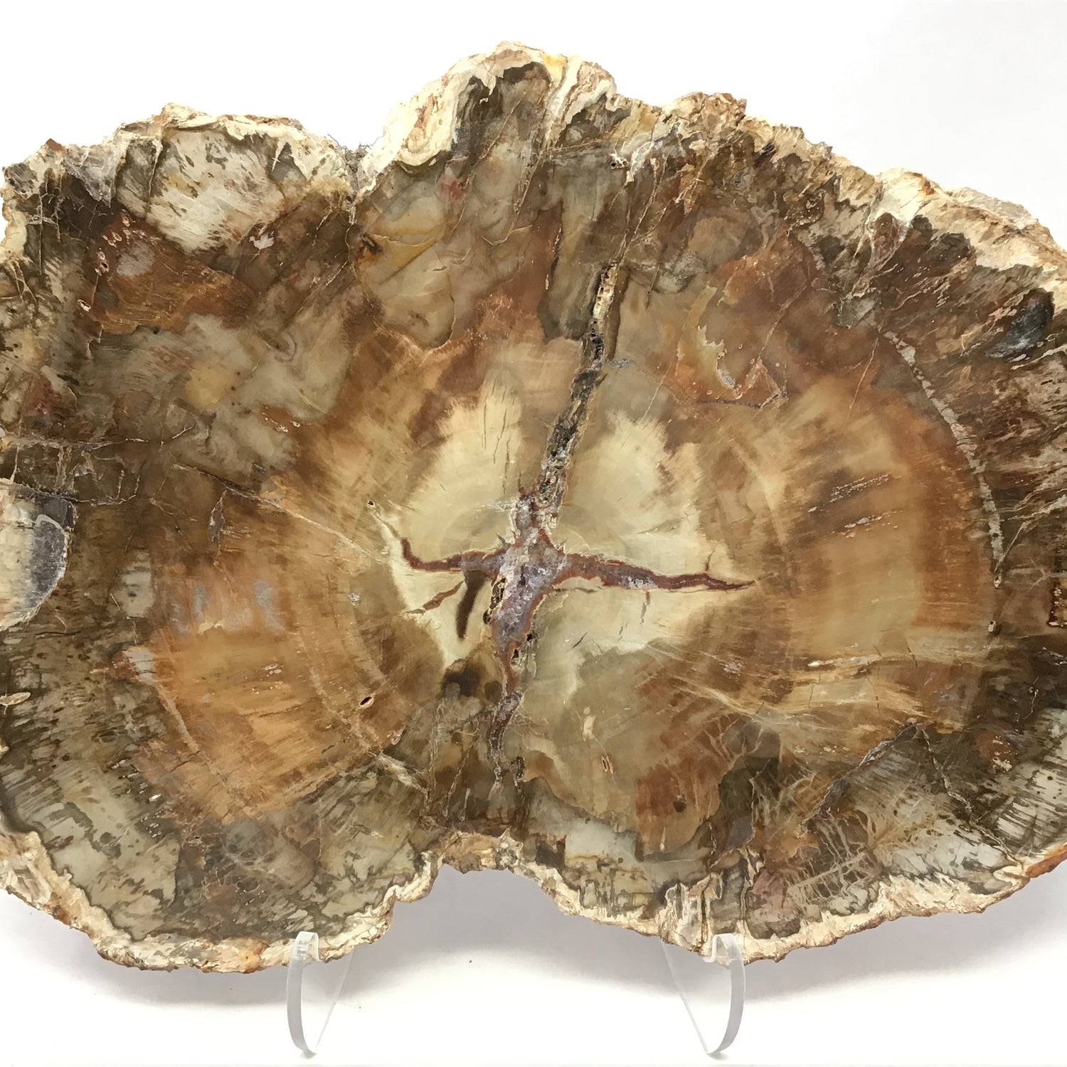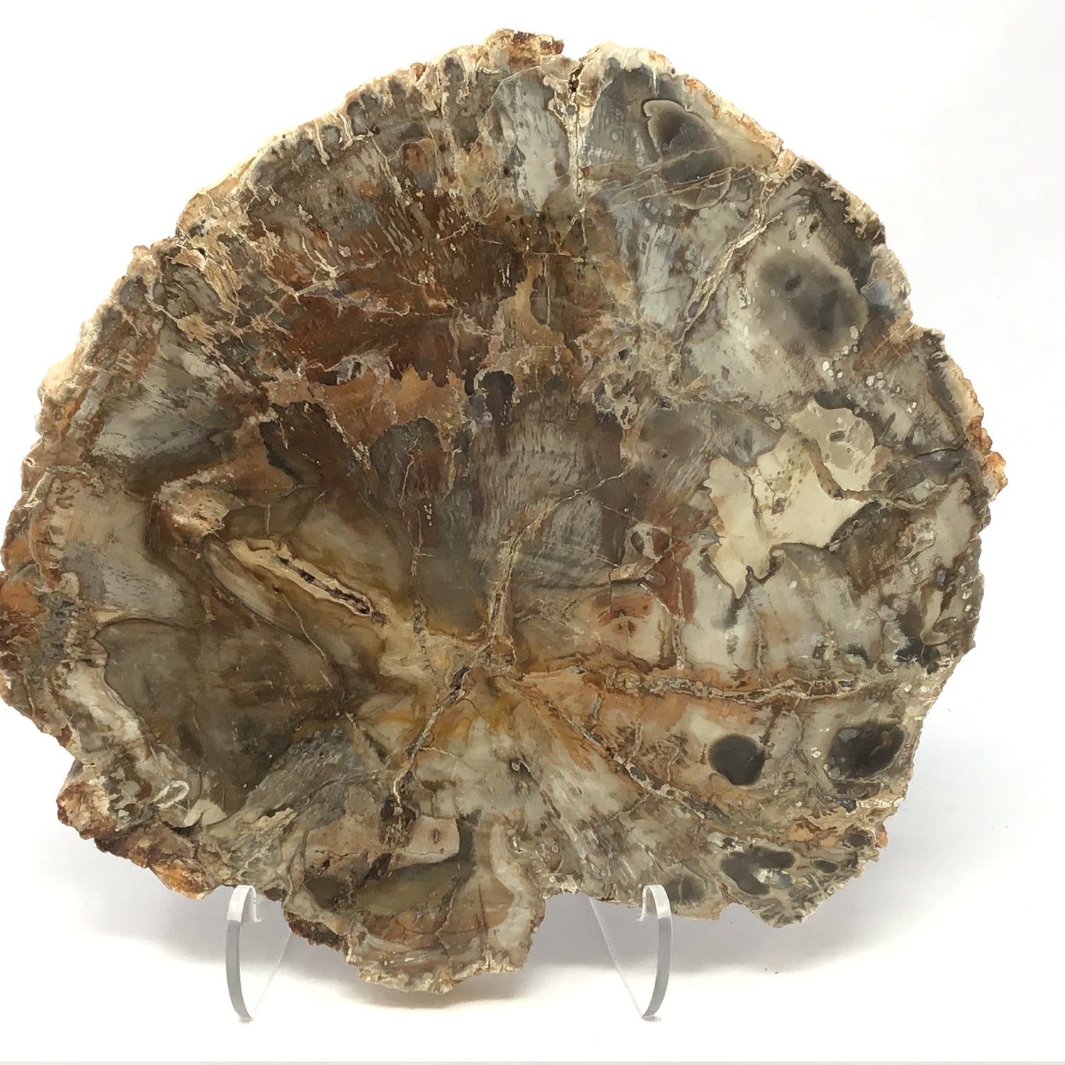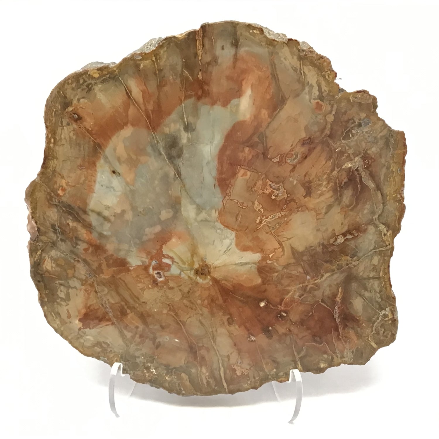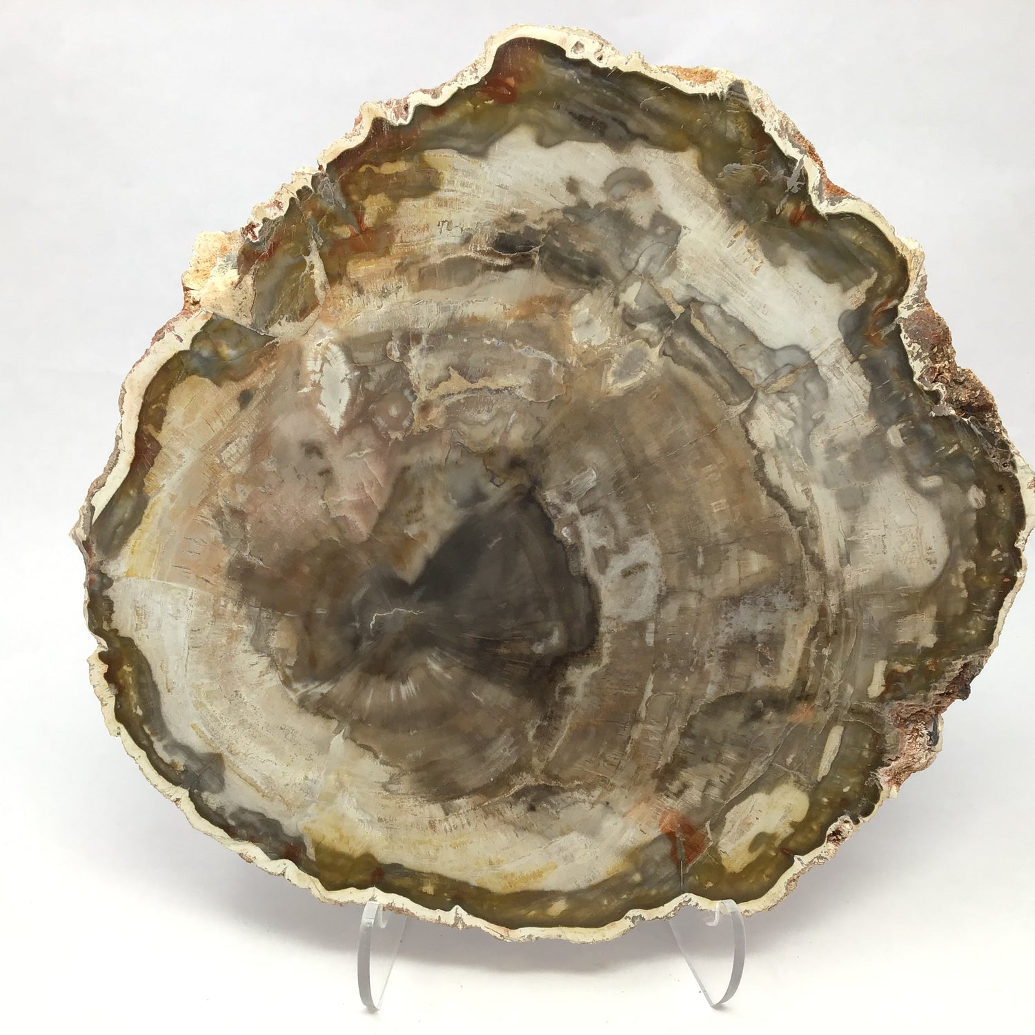 Madagascar Petrified Wood Slice with Natural Bark Edge - Medium on Lucite Easel - Pattern 2 is backordered and will ship as soon as it is back in stock.