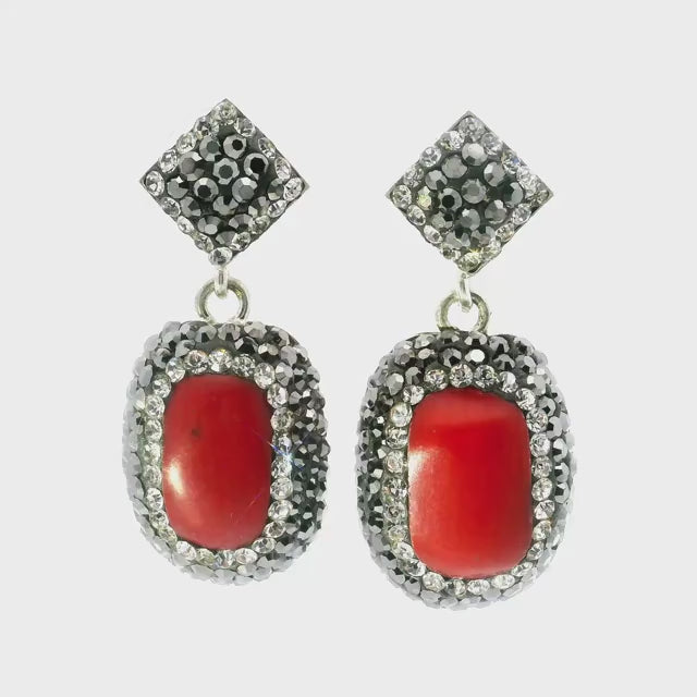 Mediterranean Coral Dangle Earrings - Rounded Rectangle Cabochon with Marcasite & Silver Swarovski Crystals with 925 Sterling Silver