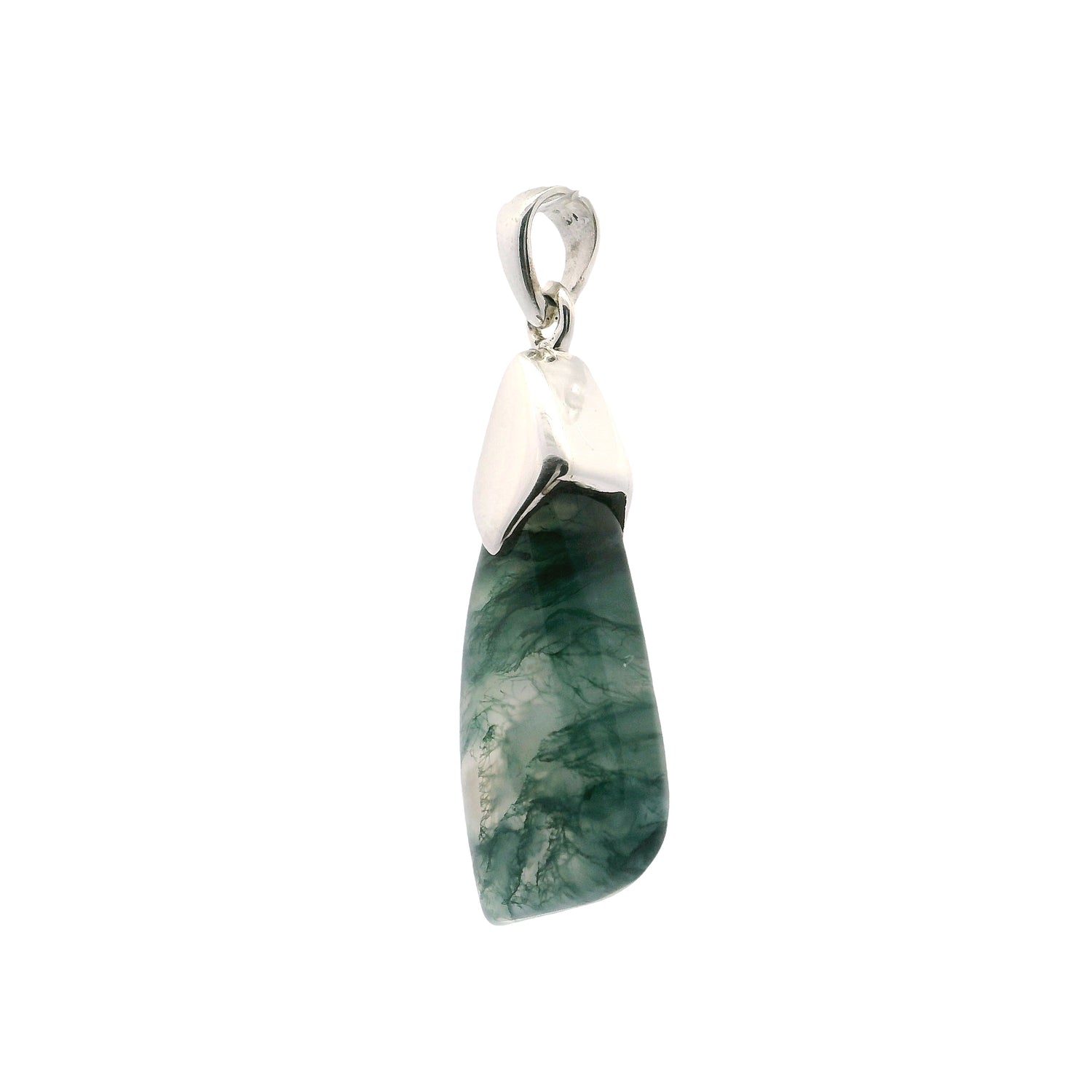 Moss Agate Freeform Pendant in Lantern Setting of 925 Sterling Silver
