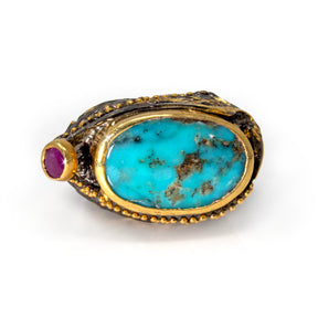 Persian Turquoise Ring Size 8.5 - Flat Cut Oval & Faceted Ruby Round with Gold Vermeil Bezels & Beading on Ornate Oxidized Sterling Silver Band with Flying Crane Design & Gold Vermeil Accents