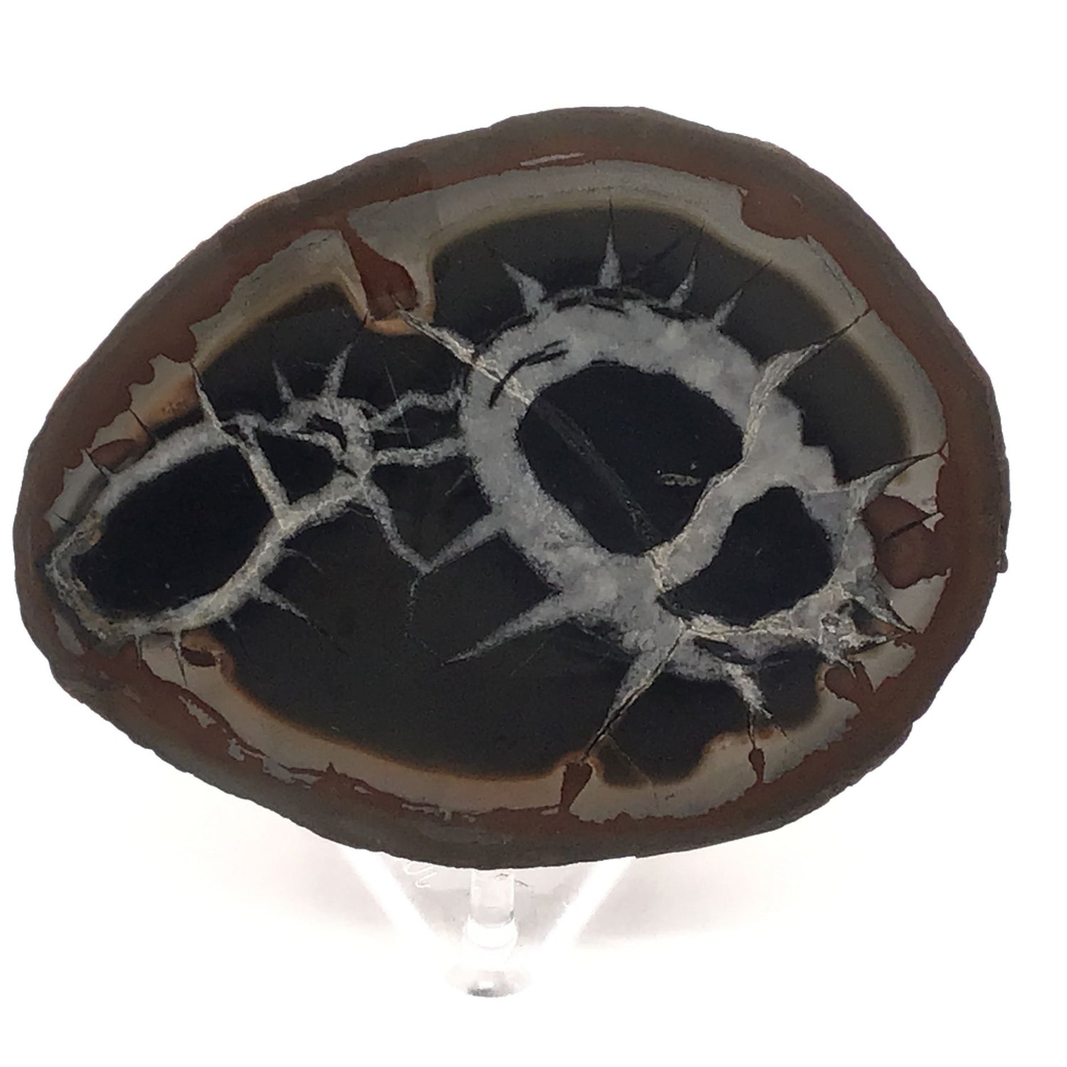 Elevate your space with this striking Septarian Nodule Slice, elegantly displayed on a clear Lucite stand. This one-of-a-kind collector’s specimen showcases the distinctive patterns and earthy hues that make Septarian so mesmerizing—rich browns interlaced with golden calcite and subtle gray limestone. Formed millions of years ago, each slice tells a unique geological story, making it a captivating focal point for any shelf, desk, or display case.