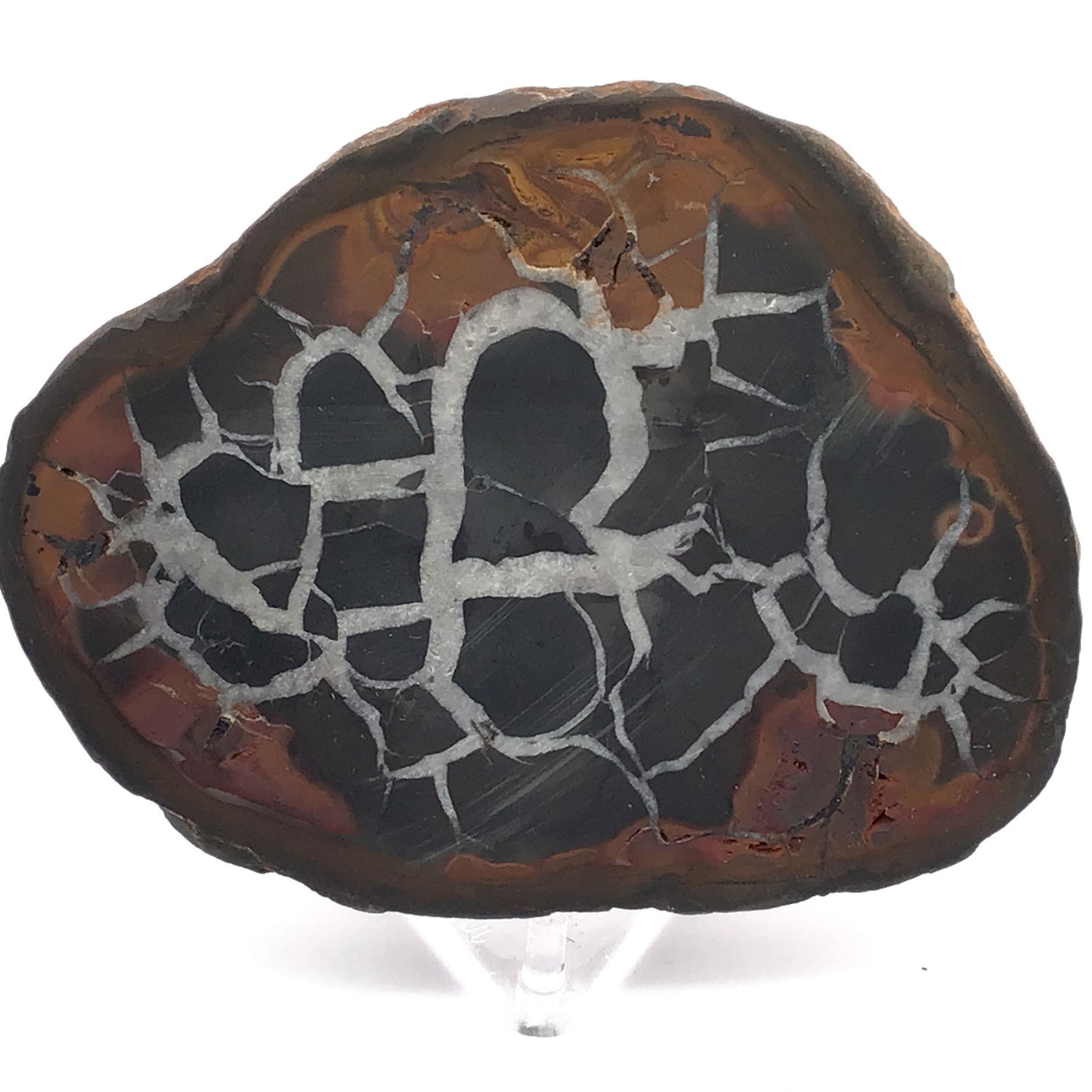 Elevate your collection with this captivating Septarian Nodule Slice, elegantly mounted on a clear Lucite stand. Each specimen showcases striking patterns of earthy browns, golden calcite, and creamy aragonite, formed naturally over millions of years. A true collector's specimen, this Septarian slice is perfect for mineral enthusiasts, interior decor accents, or anyone drawn to the unique beauty of ancient geology.