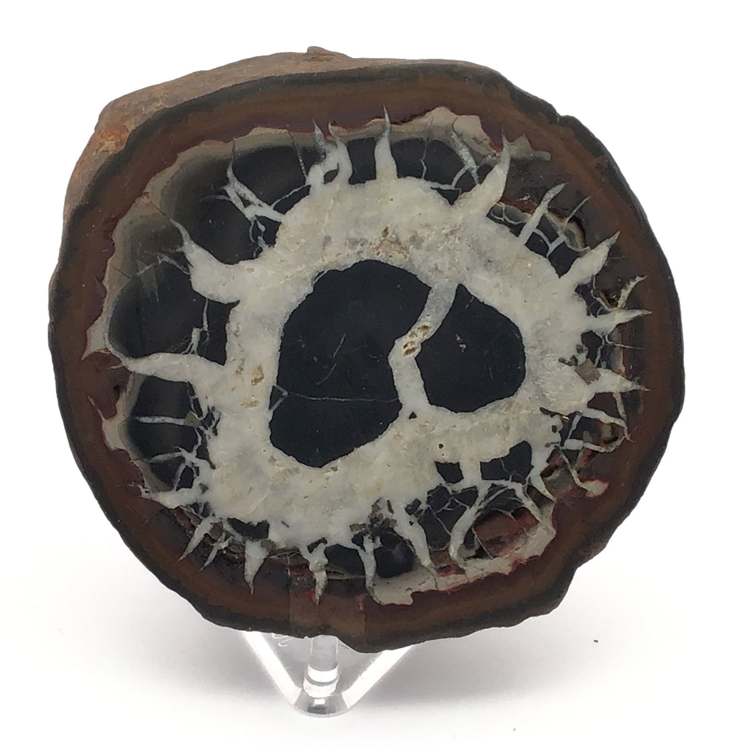 Elevate your space with this stunning Septarian Nodule Slice displayed elegantly on a crystal-clear Lucite stand. Hand-selected for its intricate patterns and rich earthy tones, this collector's specimen is a true celebration of nature’s artistry. Formed over millions of years, Septarian nodules are renowned for their mesmerizing yellow calcite crystals, swirling brown aragonite, and pale gray limestone matrix.