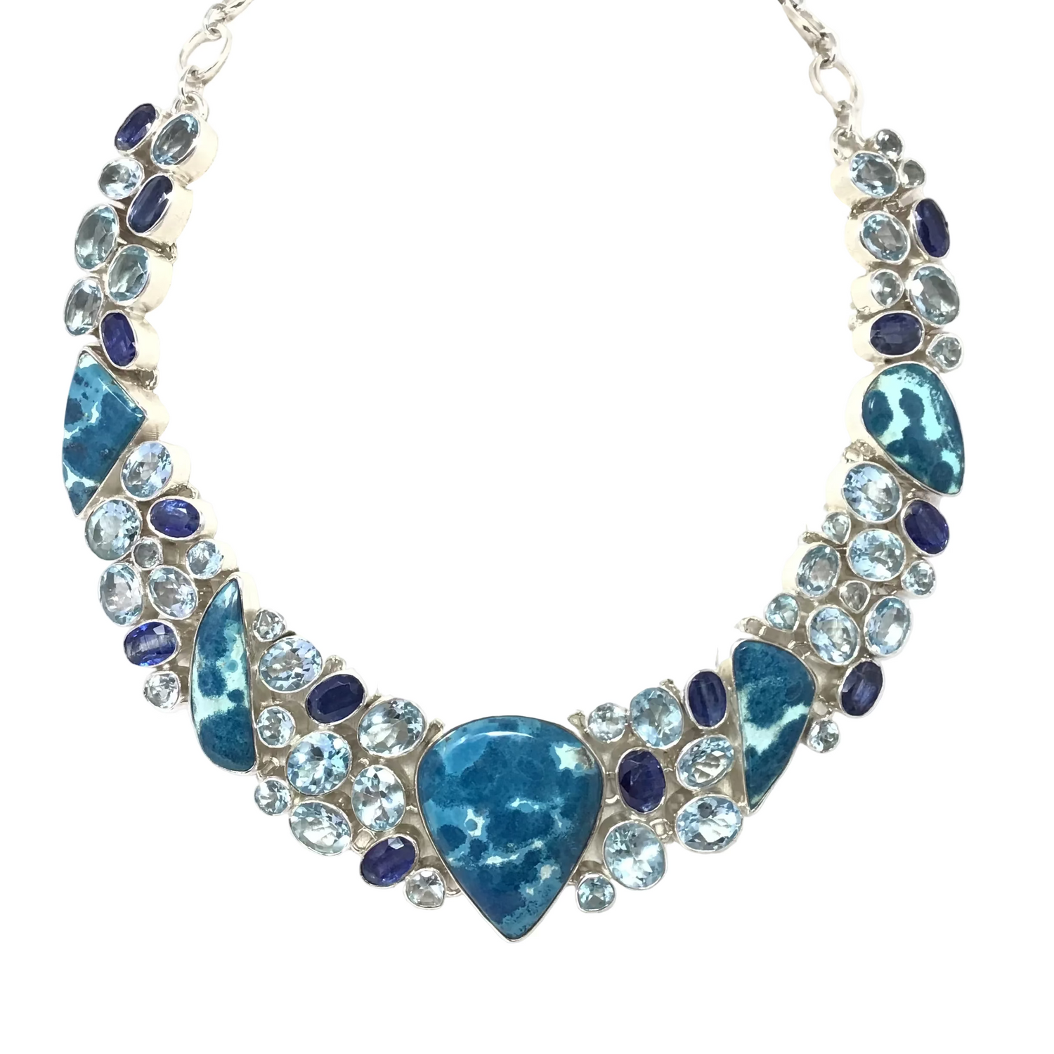 This striking collar necklace showcases a luminous reverse pear-cut Shattuckite Azurite focal stone, prized for its rich blue-green hues and natural banding patterns. The centerpiece is complemented by faceted Blue Topaz and Kyanite accents that catch light beautifully, creating depth and movement along the neckline. Handcrafted with attention to gemstone quality and design balance, this piece bridges statement jewelry and wearable art. The collar silhouette frames the décolletage elegantly, making it ideal for both special occasions and curated everyday wear. Each stone is selected for color saturation and clarity, ensuring a one-of-a-kind piece that reflects the natural beauty of these premium minerals.