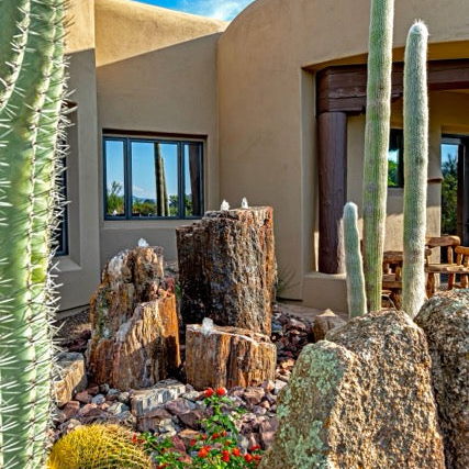 Petrified wood fountains combine the organic form of ancient wood with the durability of stone. Formed over millions of years as wood slowly mineralized, each piece preserves natural grain, bark and growth patterns while gaining the hardness and longevity of quartz-based stone. This gives petrified wood fountains a naturally sculptural, one-of-a-kind appearance that feels both earthy and timeless. Their irregular shapes and textures make them especially well suited for naturalistic landscapes, desert gardens, and spaces where a more organic, grounded aesthetic is desired.